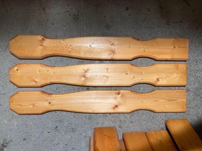 Sie wurden bereits hell lasiert, sind dann aber nicht mehr zum Einsatz gekommen. Die Bretter wurden dunkel und trocken gelagert, dennoch sind sie minimal verdreht (sollte sich bei der Montage gerade ziehen).