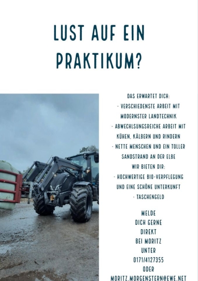 Bei all den Treckern auf der Straße hast du Lust bekommen, selber mal so einen zu fahren? Oder willst gucken, ob Landwirt/in nicht genau der richtige Beruf für dich ist? Wir bieten dir die Chance, es auszuprobieren! Komm zu uns, helfe mit bei der Frühjahrsbestellung, der ersten Grasernte, dem Weideaustrieb und erlebe unvergessliche Momente, die nur die Landwirtschaft dir bieten kann!