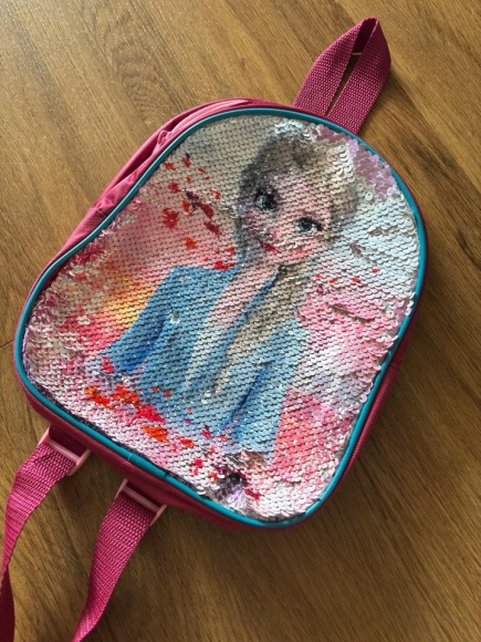 Der Rucksack ist von Frozen/Eiskönigin und das Bild auf der Sichtseite lässt sich ändern, in dem man mit der Hand drüber streicht.
