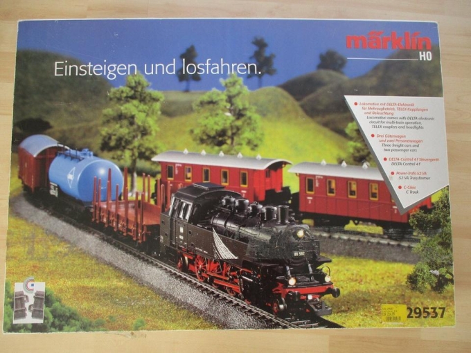 Wir verkaufen eine sehr gut erhaltene Märklin 29537 H0 Zugpackung mit der Dampflok BR86 und großer C-Gleisanlage.