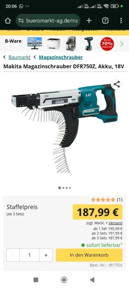 Magazinschrauber von Makita, so gut wie neu, nur kurz verwendet, voll funktionstüchtig, steht zu verkaufen, zusammen mit 3 volle Kartons Schnellschrauben (1000/Karton). Näheres in die Fotos.