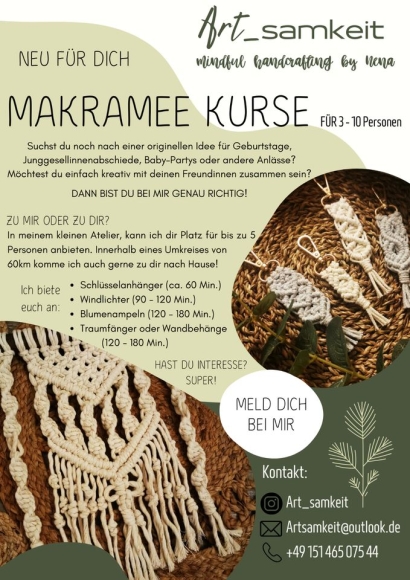 Ich biete Makramee Kurse für 3 - 10 Personen an.