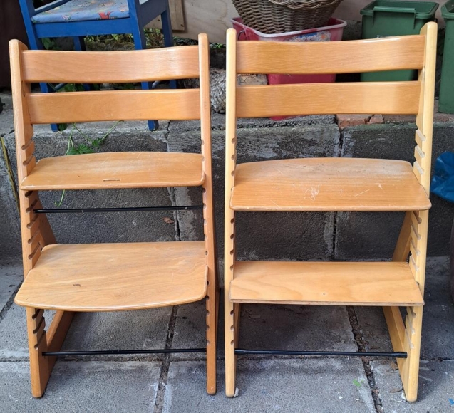 Wir verkaufen zwei mitwachsende Kinderstühle ähnlich wie Tripp Trapp für jeweils 25 € und 15 € , mit einigen Gebrauchsspuren, siehe Bilder.