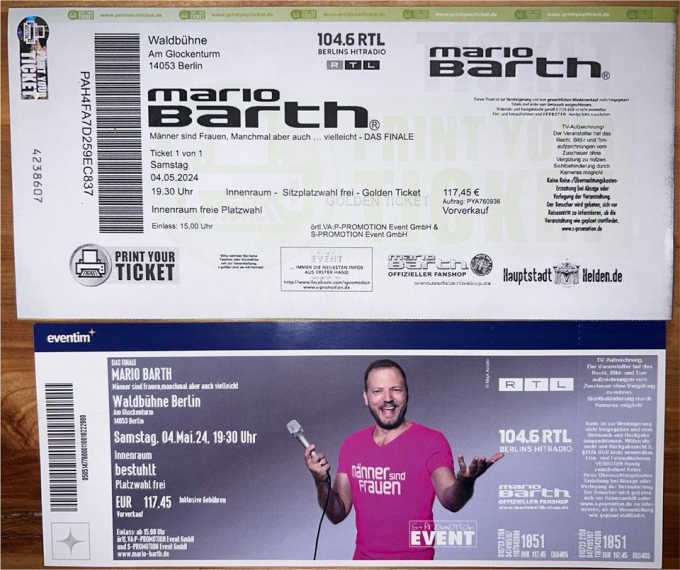 Verkaufe meine Mario Barth Tickets das Finale in der Berliner Waldbühne am 4.5.2024 der Preis wäre pro Ticket, zum Verkauf stehen zwei.