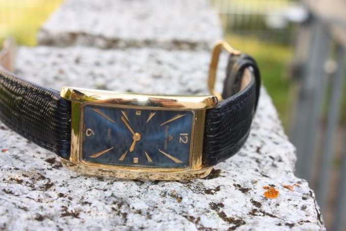 Biete aus Uhrensammlung Maurice Lacroix "FIABA/Tank" Quarz Damen-Armbanduhr. Gehäuse 18kt. vergoldet, poliert - Ref.: 47495. Blaues Zifferblatt, arabische Ziffern und Zeiger in gold. ETA Uhrwerk - 3 ATM wasserdicht. Die Uhr läuft präzise und genau, neue Batterie.