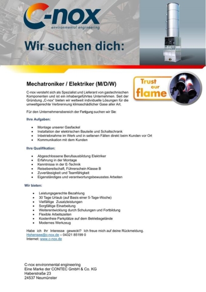 C-nox versteht sich als Spezialist und Lieferant von gastechnischen Komponenten und ist ein inhabergeführtes Unternehmen. Seit der Gründung „C-nox“ bieten wir weltweit individuelle Lösungen für die umweltgerechte Verbrennung klimaschädlicher Gase aller Art.