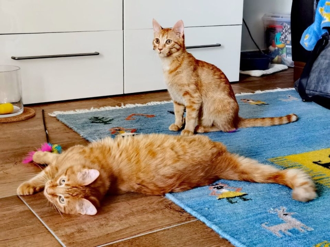 Komplett rote Kätzinnen sind relativ selten. Schon deshalb ist Milka etwas Besonderes. Sie ist eine aktive und verschmuste Katze. Sie liebt es, sich neben ihren Menschen auf den Rücken zu werfen und den Bauch kraulen zu lassen. Mit ihren Bruder Keks spielt sie besonders gerne Fußball mit Flummies oder jagt der Angel hinterher.