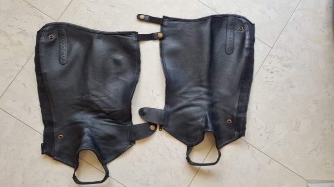 Verkaufe sehr gut erhaltene Rindsleder-Mini-Chaps, feinkörnig. Hergestellt aus geschmeidigem Leder, damit es für optimalen Komfort perfekt um die Wade passt. "YKK" -Reißverschluss hinten, geschützt durch Druckknöpfe an einer Klappe oben und unten am Schaft. Mit Leder verstärkte elastische Fußriemen.