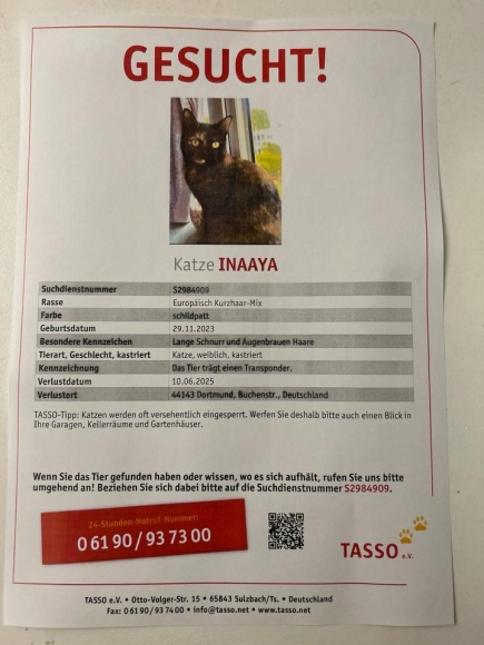 meine Katze ist am 10.06.2025 außer Haus und kommt nicht mehr zurück was sehr untypisch für sie ist da sie es nicht lange draußen aushält