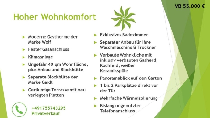  Die soeben abgeschlossenen Renovierungsarbeiten ermöglichen Ihnen eine sofortige Bereitstellung der Wohnfläche. Der feste Gasanschluss ist nur ein kleines Beispiel der Vorzüge. Denn auch der zementierte Estrich unterhalb der Wohnfläche, nebst Anbau und separater Blockhütte, sind nur einige Besonderheiten dieses exklusiven Angebotes.