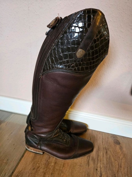 Verkaufe schöne Lederreitstiefel in braun von Mountain Horse. Schöner Kroko Lackverzierung am Schaftende. Die Stiefel haben die Größe 42 und eine Höhe von 40 cm und einen Umgang von 40,5 bis 43,5 cm (Gummieinsatz). Die Stiefel befinden sich in einem guten Gebrauchten Zustand und wurden immer gepflegt. Der Neurpreis lag bei 399 Euro.