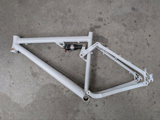 schöner mountainbike fahrradrahmen, mit rock shox stossdämpfer, er ist grundiert.