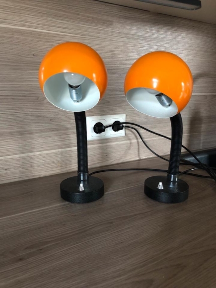 2 tolle 70er Jahre Nachttischleuchten mit rundem Metallschirm, außen in orange, innen in weiß. Die Leuchten sind biegsam und funktionieren einwandfrei.