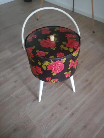 Wir verkaufen ein schönes Nähkästchen aus den 70ern. Rund und dreibeinig.