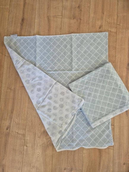 In zarten Farben: Sabeigrünes (Graugrünes) Rautenmuster, Rückseite: Graue Tupfen.