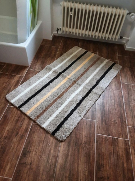 Neuer, großer weicher Badvorleger in beige mit schwarz gelb braunen Streifen, gummierte rutschhemmende Rückseite, atmungsaktiv, rundum gekettelt, 80cm x 140 cm, Paypal möglich....