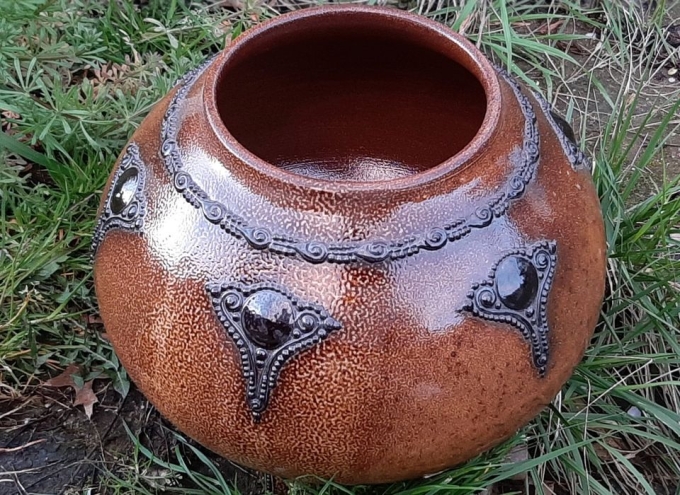 Entwurf Paul Wyand 1909, Ausführung Reinhold Merkelbach/Grenzhausen, Modellnummer 2117, Prägemarke, Steinzeug braun salzglasiert,geflammt, sechsfacher dunkelbrauner Medaillondekor, Bodenspinne 30cm Ø,siehe Westerwälder Steinzeug des Jugendstils,