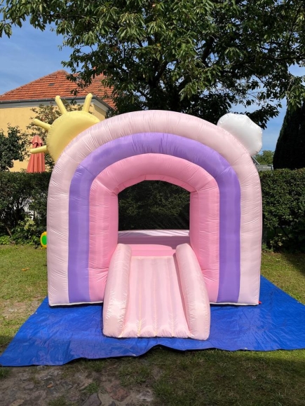 Wir vermieten diese tolle kleine Hüpfburg im Regenbogen Design mit Rutsche, welche aufgrund ihrer geringen Stellfläche drinnen bei entsprechender Deckehöhe, sowie draußen in kleineren Gärten genutzt werden kann.