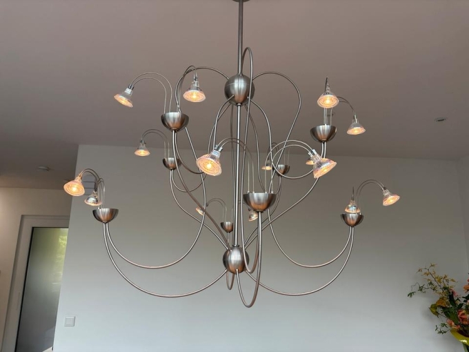 Dieser schöne Kronleuchter hat acht Ausleger mit jeweils zwei LED Lampen. Die Lampe ist dimmbar. Höhe ist ca 1,25 m.