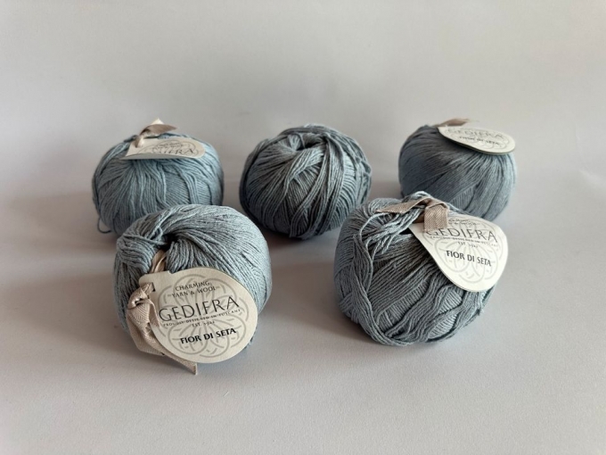 Hier stehen insgesamt 5 Knäul Garn von Gedifra zum Verkauf. Die Farbe ist ein zartes Hellblau und ist mit „1261“ angegeben. Das Garn besteht zu 100% aus Seide. Je Knäul sind es 50g und die Lauflänge beträgt 165m.