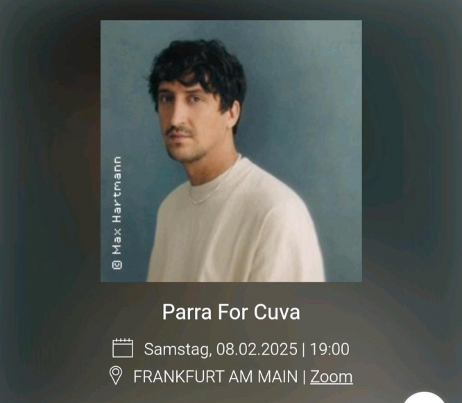 Hey! Ich verkaufe 2 Tickets fürs *Parra For Cuva* Konzert am Samstag den 8.2 im Zoom in Frankfurt.