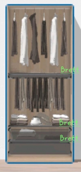 Die Einlegeböden Hosenhalter und Schubladen sind in dunkel braun gehalten.
