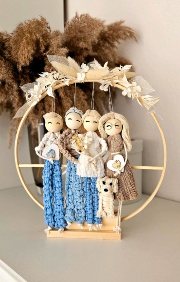 In liebevoller Handarbeit hergestell! Familien Porträt aus Makramee Puppen im Ring und Trockenblumen. (Ringe in verschiedenen Formen und Farben verfügbar)