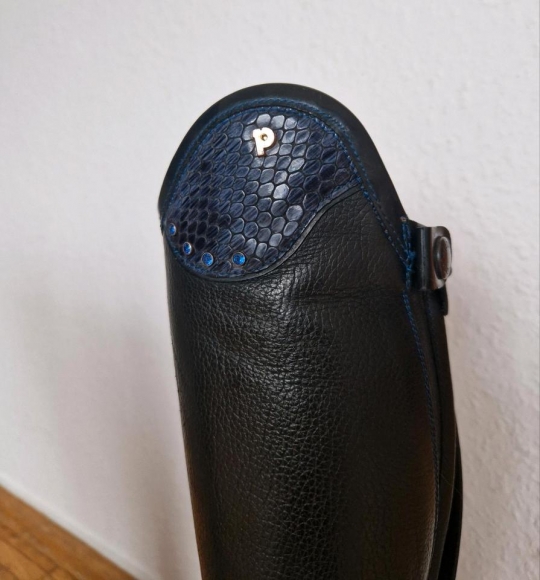 Ich verkaufe selten getragene Lederreitstiefel von Petrie, Modell Luca, schwarz mit blauen Akzenten (Croco, Glitzersteinchen und Nähte). Reißverschluss hinten.