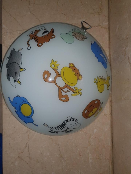 eine Kinderzimmerdeckenlampe mit lustigen Tieren darauf. Sie ist aus Glas, rund und wird in die Deckenfassung eingespannt. Da es kein klares Glas ist, blendet die Lampe nicht.
