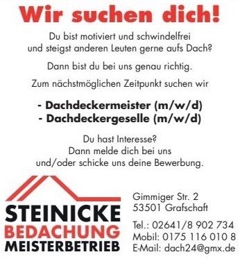Wir sind ein erfahrenes Dachdeckerunternehmen und suchen ab sofort nach engagierten Mitarbeitern. Wenn du Dachdeckermeister oder Dachdeckergeselle bist und Lust hast, in einem motivierten Team an spannenden Projekten zu arbeiten, freuen wir uns sehr auf deine Bewerbung!