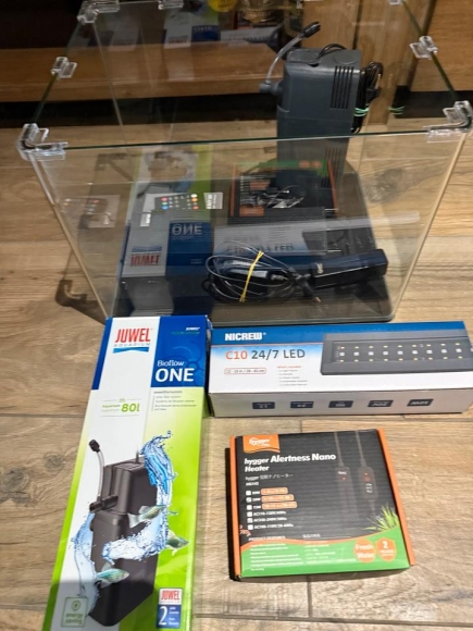 Filter ist ein Juwel Bioflow One , Nicrew RGB LED mit Fernbedienung und Funktionen wie Sonnen Auf/Untergang , hygger Nano Heizer mit digitaler Anzeige und trocken Laufschutz .