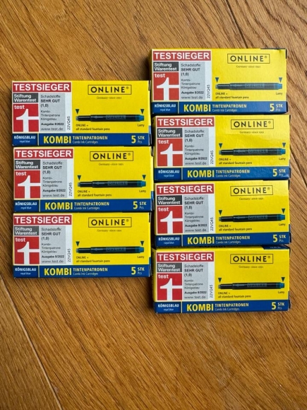 Verkaufe 7 volle Packungen à 5 Patronen Online Tintenpatronen in blau.