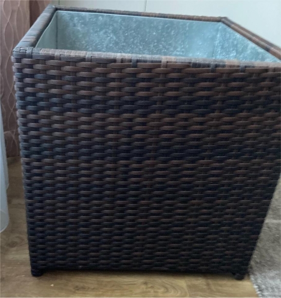 Pflanzgefäß braun geflochten, innen Zink oder anderes Metall, Boden hat Rostflecken, ist aber dicht.