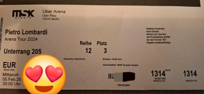 Biete hier mein Ticket an, Konzertbeginn 20 Uhr, Einlass ab 18.30 Uhr. Unterrang 205, Reihe 12 Platz 3.