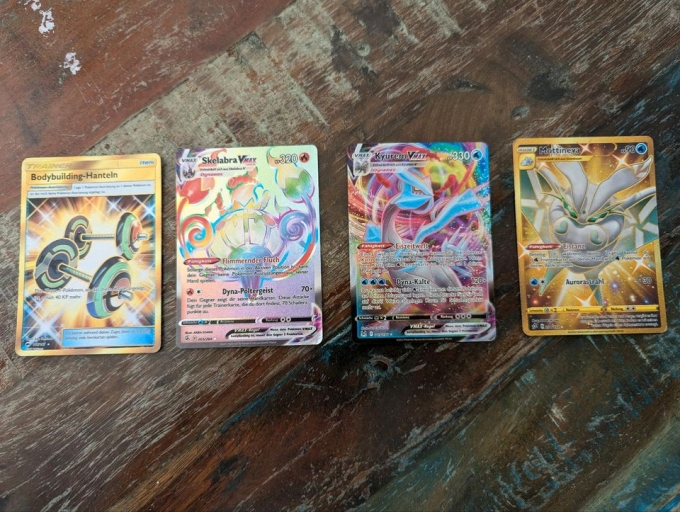 Mein Sohn bietet hiermit ein paar seiner Pokémon Karten zum Kauf an. Es handelt sich um seltene Karten, siehe Bilder. Es sind zwei VMAX Karten von Kyurem und Skelabra, sowie eine Phase 1 mit Mottineva und einer Trainer Karte "Bodybuilding -Hanteln".