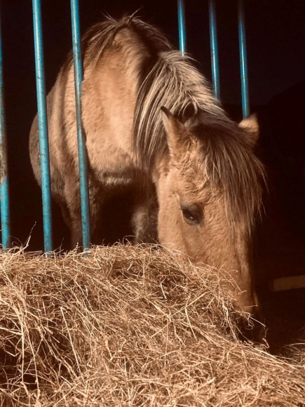 Durch ihren Hängerücken ist sie nicht mehr reitbar. Und wird daher als reinen Beisteller abgegeben.