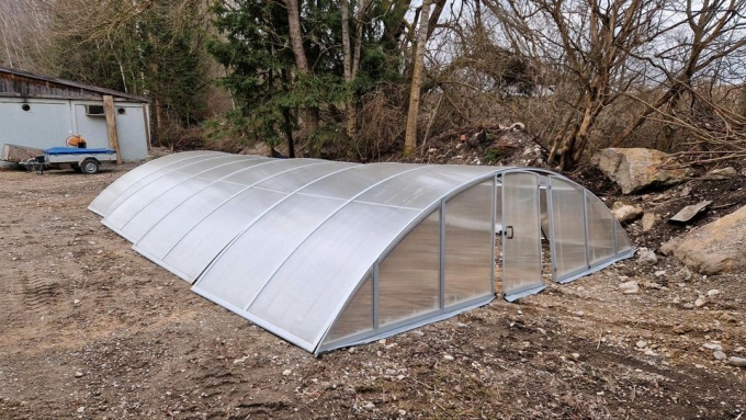 Die Überdachung besteht aus 4 Elemente die je 5,50mlang und 2,25m breit sind und eine Höhe von 1,40m haben.