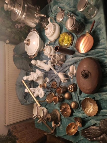 Biete ein Konvolut aus Metall und Porzellangegenständen,ca 40Einzelteile,insgesamt ca.10 Kg Messing,2 Kg Kupfer,die Bierseidel, im Vordergrund rechts,sind nicht mehr dabei.