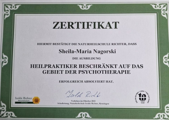 im August 2023 habe ich meinen Vorbereitungskurs für die amtsärztliche Überprüfung als Heilpraktikerin beschränkt auf das Gebiet der Psychotherapie beendet. Im Oktober 2024 habe ich meine schriftliche Überprüfung.