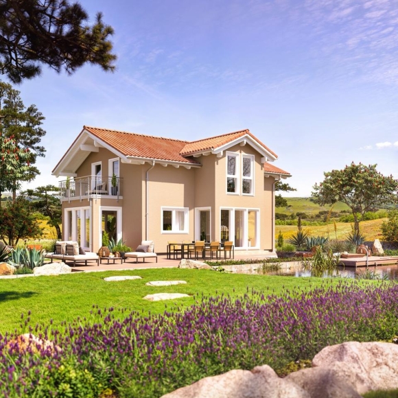 Ganz modern ausgeführt in einer Variante mit hohem Kniestock, 25° Satteldach und vielen Fensterflächen oder ebenfalls zeitgemäß interpretiert als Flachdach-Planungsvorschlag mit einem Querhauselement und Terrassenbalkon. Es geht allerdings auch anders: mediterran mit Querhaus, Balkon und Erker. Ganz nach Ihrem Geschmack und in vielen weiteren Varianten. Denn auch mit einem Walmdach macht EVOLUTION 122 eine klasse Figur.