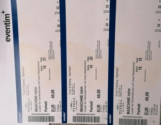 Hallo, ich verkaufe 3 Karten für das Konzert im Tivoli in Freiberg. Preis wie auf den Tickets steht.