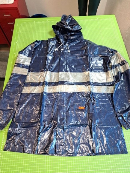 80er PVC Regenjacke elmondo super geiles Material super soft Plastic Coat Sammlerobjekt,Super geile Farbe metallic perl dunkelblau mit silbernen streifen innen Hochglanz Regenjacke verschweißte Nähte in der folie nicht mehr zu bekommen, Reißverschluss 100% PVC Plastic Gr.XL Lack glossy super weiche Pvc Folie glänzend , 2 seitliche Taschen,kapuze mit Kordelzug,Windleiste innen , sowie durchgehenden Reißverschluss Brustweite 58cm Gesamtlänge jacke 76cm ab Schulter gemessen Armlänge ab Achsel gemessen 54cm