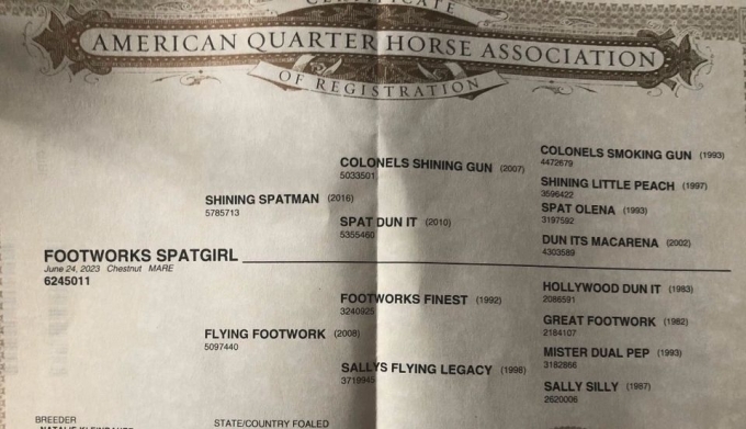 Ihr Vater, der dunkle Chestnut Hengst Footworks Finest, hatte über $ 90.000 NRHA LTE und war u.a. 7th, 1995 NRHA Open Futurity, 6th, 1995 Congress Open Reining Futurity, 1995 Oklahoma RHA Open Futurity Champion, 1996 NRHA Open Derby Reserve Champion und NRHA Open Super Stakes Reserve Champion, 1998 NRHA Open Reserve World Champion, 2005 Congress Senior Reining Champion (