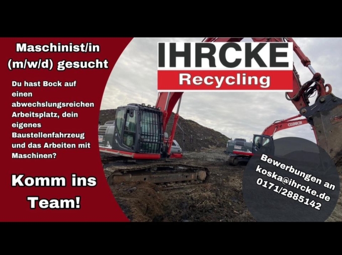 Du suchst eine spannende Herausforderung als Maschinist/in? Dann bist du bei uns genau richtig! Wir die Ihrcke Recycling sind auf der Suche nach einem/einer Maschinisten/in, der/die uns bei der Brechung und dem Sieben von Schüttgütern unterstützt. Dein Einsatzgebiet wird hauptsächlich im Raum Bremen/Bremerhaven liegen, aber auch Einsätze in Niedersachsen sind möglich.