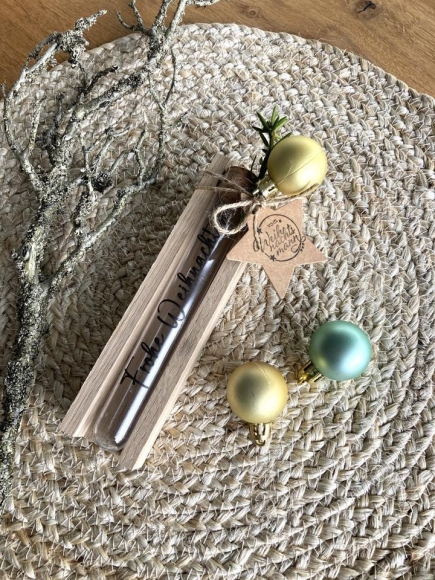 Reagenzglas mit Korken und der Aufschrift "Frohe Weihnachten" in schwarz. Die ideale kleine Verpackung für Geldgeschenke. Mit Klötzchenverpackung aus Eichenholz, kleinem Anhänger aus Kraftpapier sowie einer Weihnachtskugel (Farbe variiert).