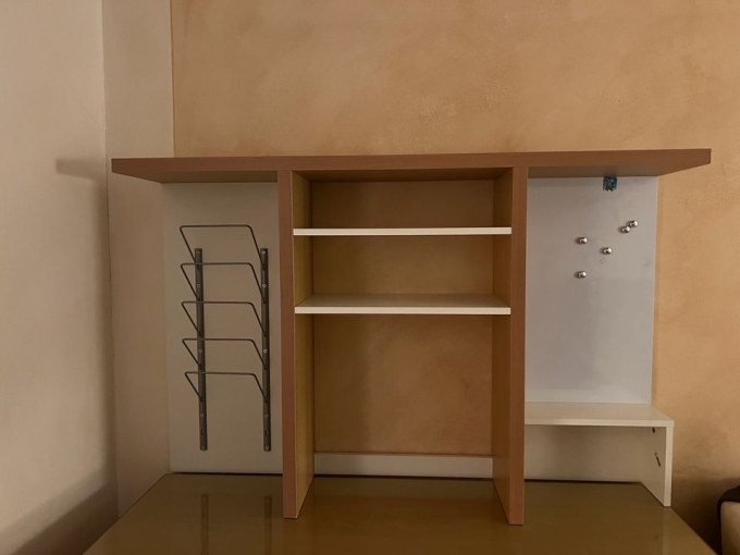 Ich biete ein abnehmbares Regal an, welches die passend zum Ikea Schreibtisch „MALM“ ist. Man kann es mit einer Verbindung auch an der Wand befestigen.