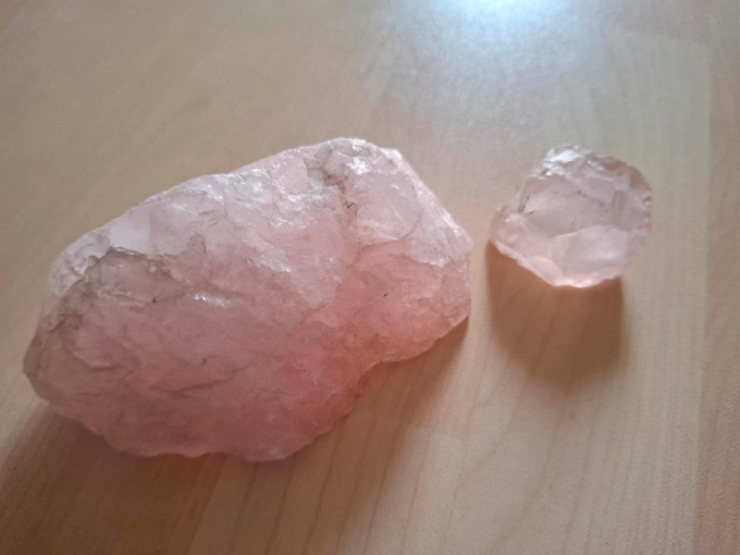 Zwei Stücke Rosenquarz (lagen schon länger in der Vitrine).