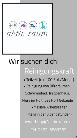 Wir suchen zu sofort eine Reinigungskraft für unser Schwimmbad und unsere Büroräumlichkeiten sowie für die Flure und Treppenhäuser im Holthues Hoff Gebäude in Ahaus.