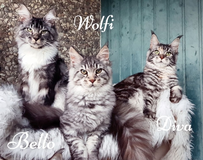 Da Maine Coons bis zu 4-5 Jahren noch wachsen, sind Sie noch im Teenageralter. Bello ist nur 12 Monate alt und Wolfi 1,5 Jahre jung.