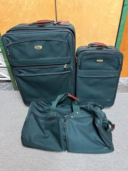 1 großer und 1 kleiner Koffer sowie 1 große Reisetasche aus robustem Stoff mit groben Metallreissverschlüssen und jeweils 2 Rollen